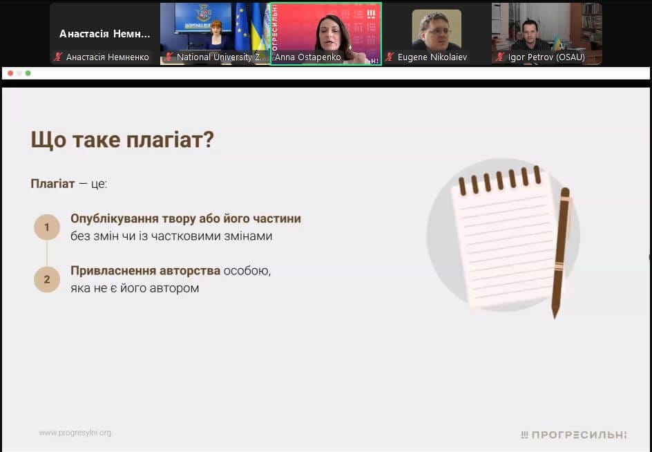 - Ганни ОСТАПЕНКО, співзасновниці ГО «Прогресильні», яка розповіла, як створити освітнє середовище без плагіату.