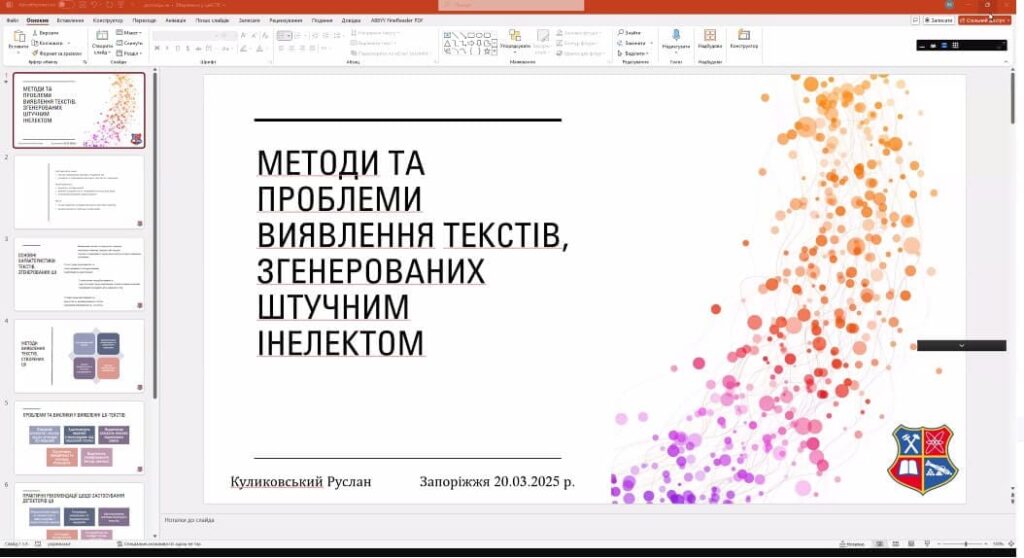 - Руслана КУЛИКОВСЬКОГО, проректора НУ «Запорізька політехніка», який розповів про використання штучного інтелекту для виявлення плагіату та маніпуляцій з текстами.