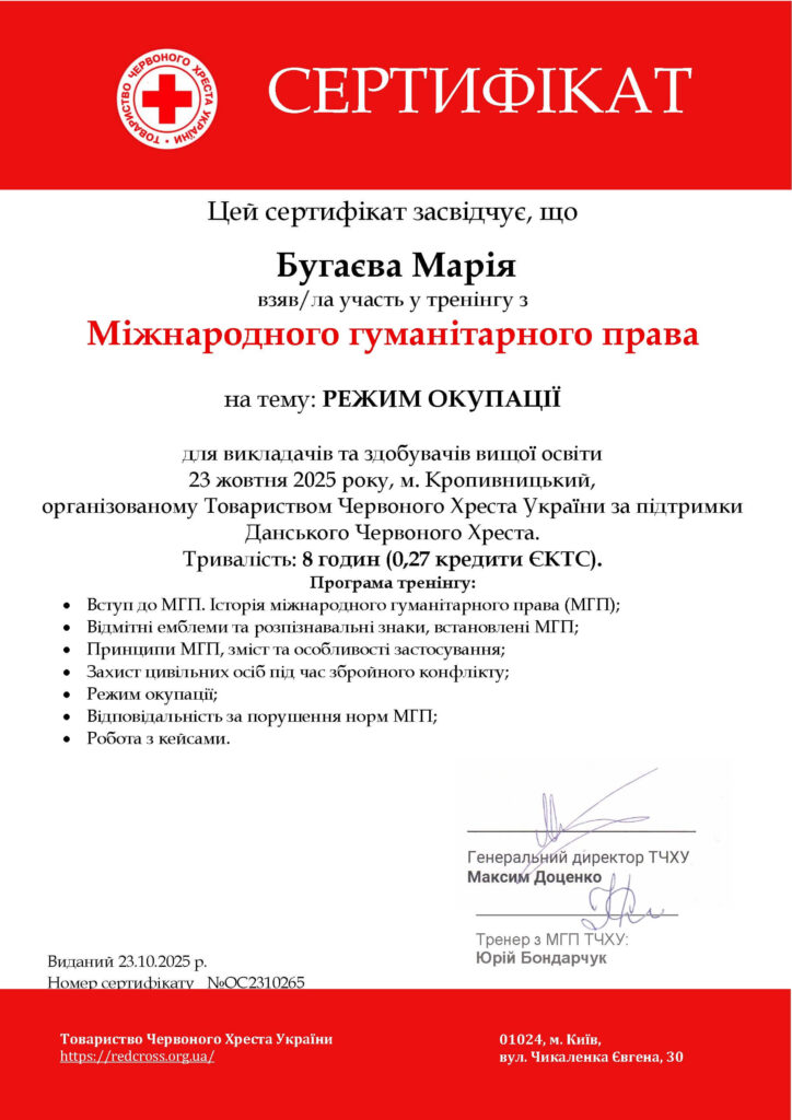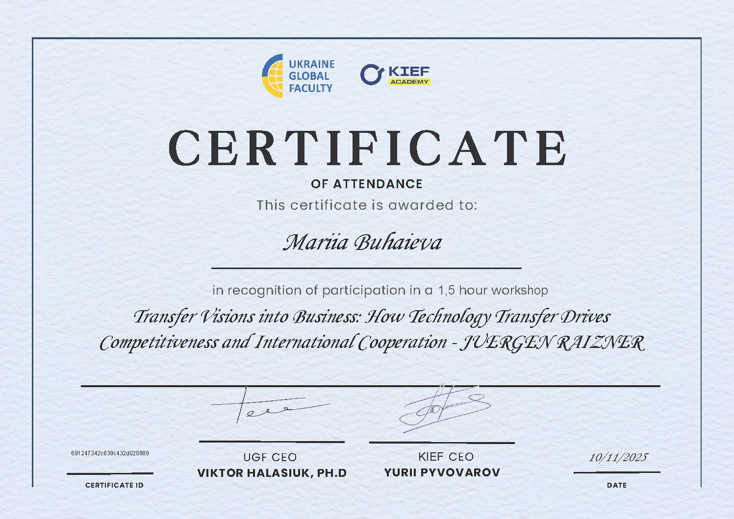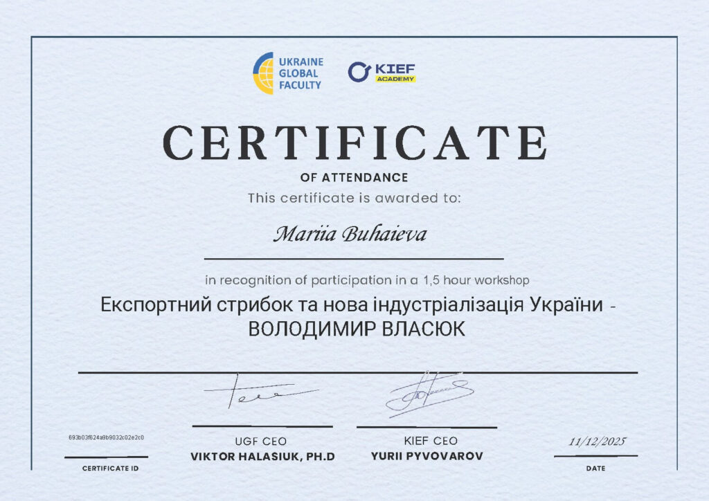 - Кіровоградський національний технічний університет (диплом магістра з відзнакою, спеціальність «Міжнародна економіка», кваліфікація – економіст з міжнародної економіки, 2008 р.)