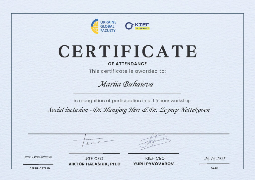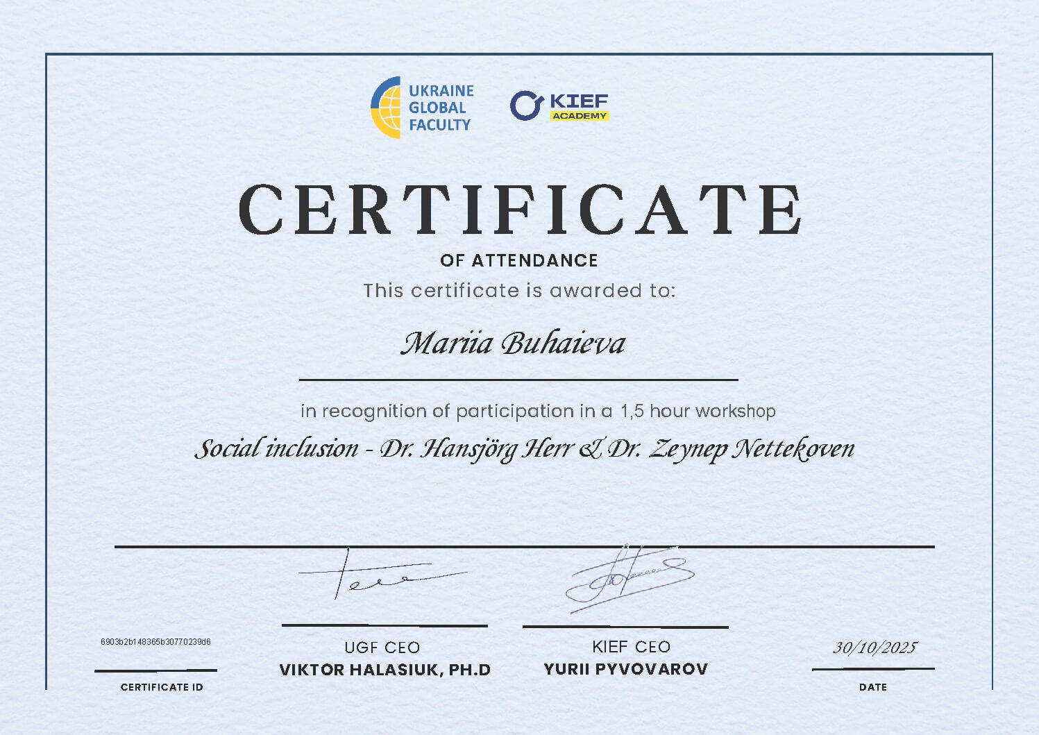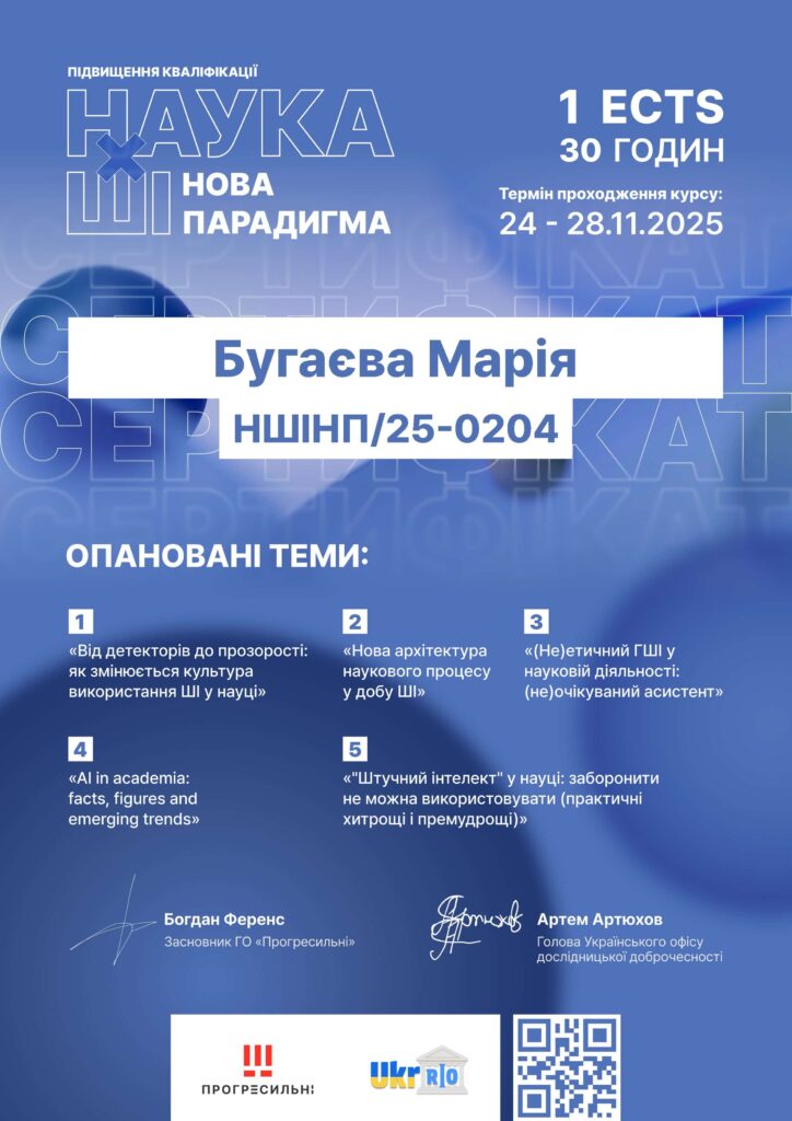 - Кандидат економічних наук з 2013 р. за спеціальністю 08.00.05 – «Розвиток продуктивних сил і регіональна економіка». Дисертацію захистила у спеціалізованій вченій раді Національної академії природоохоронного та курортного будівництва (диплом ДК№014805)