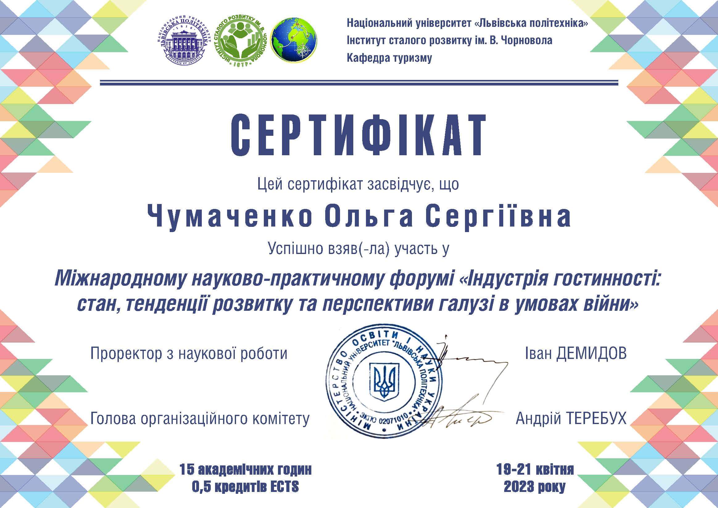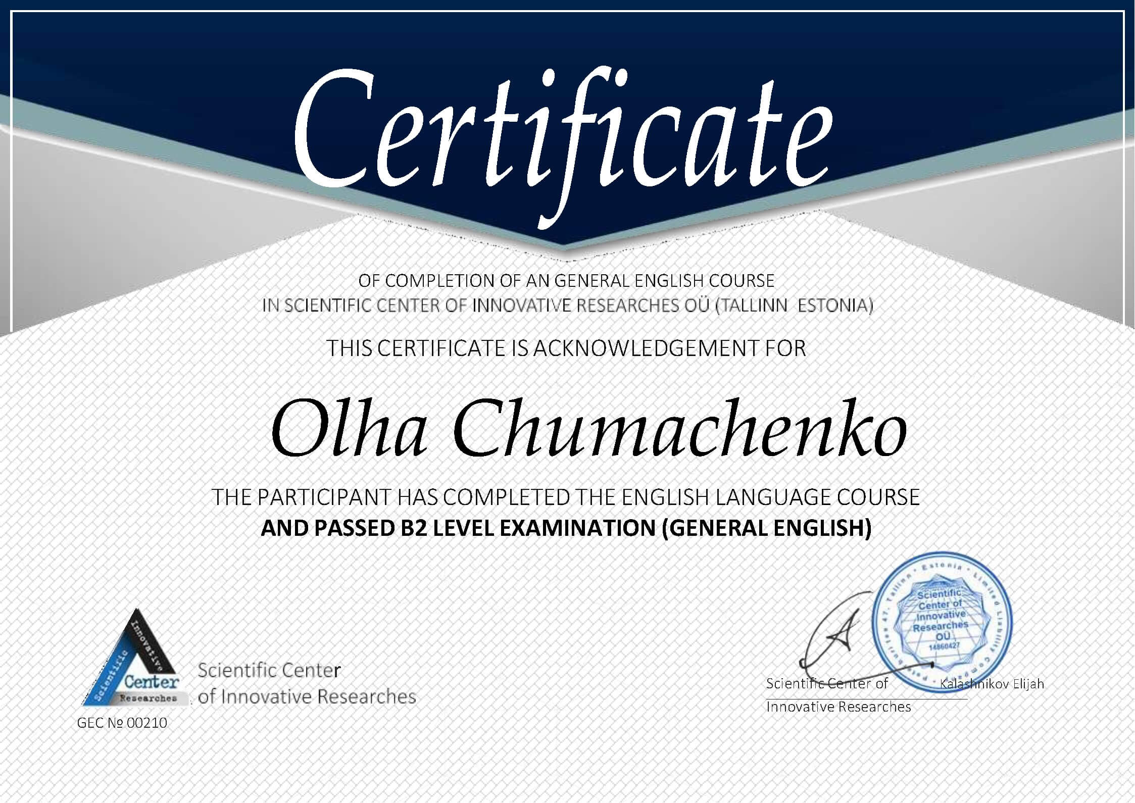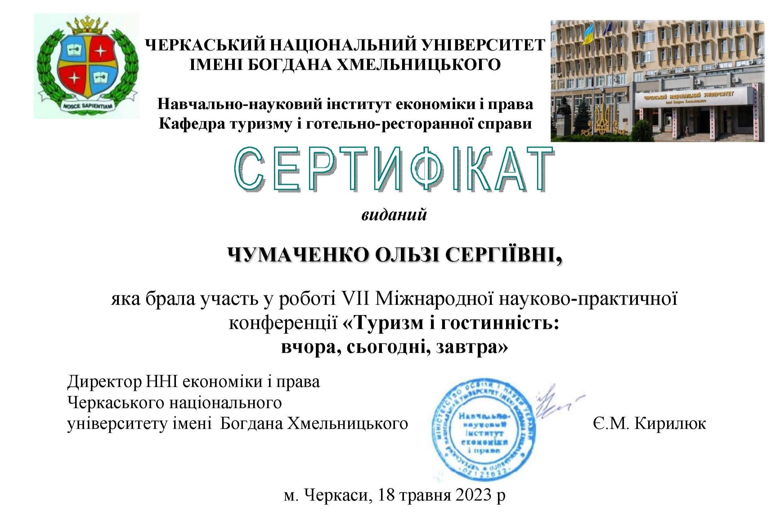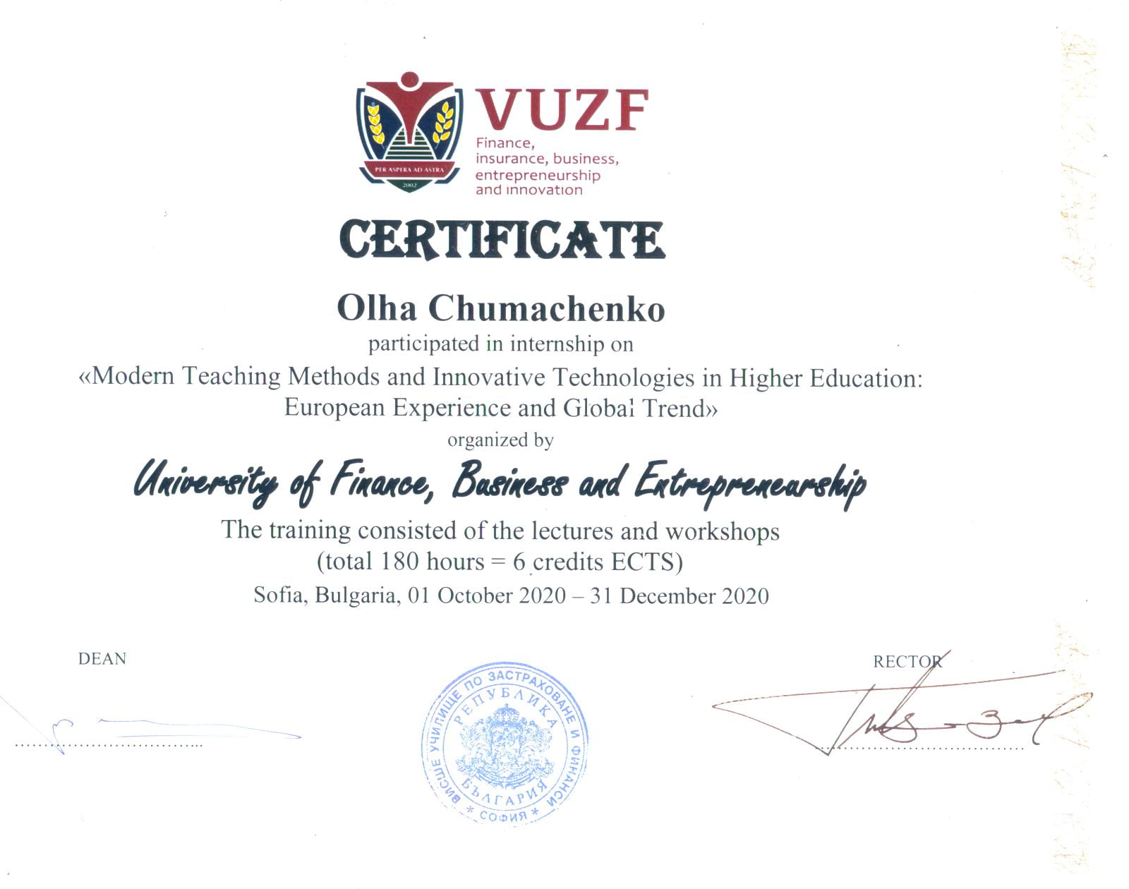 - Кіровоградський національний технічний університет (диплом спеціаліста, спеціальність «Економіка підприємства», кваліфікація економіст, 2014 р.)