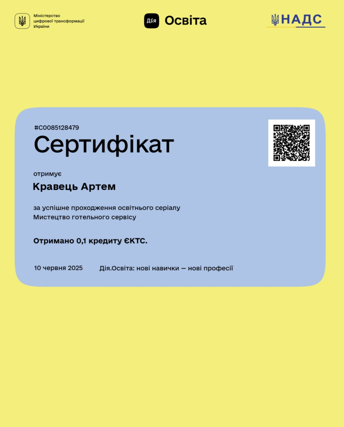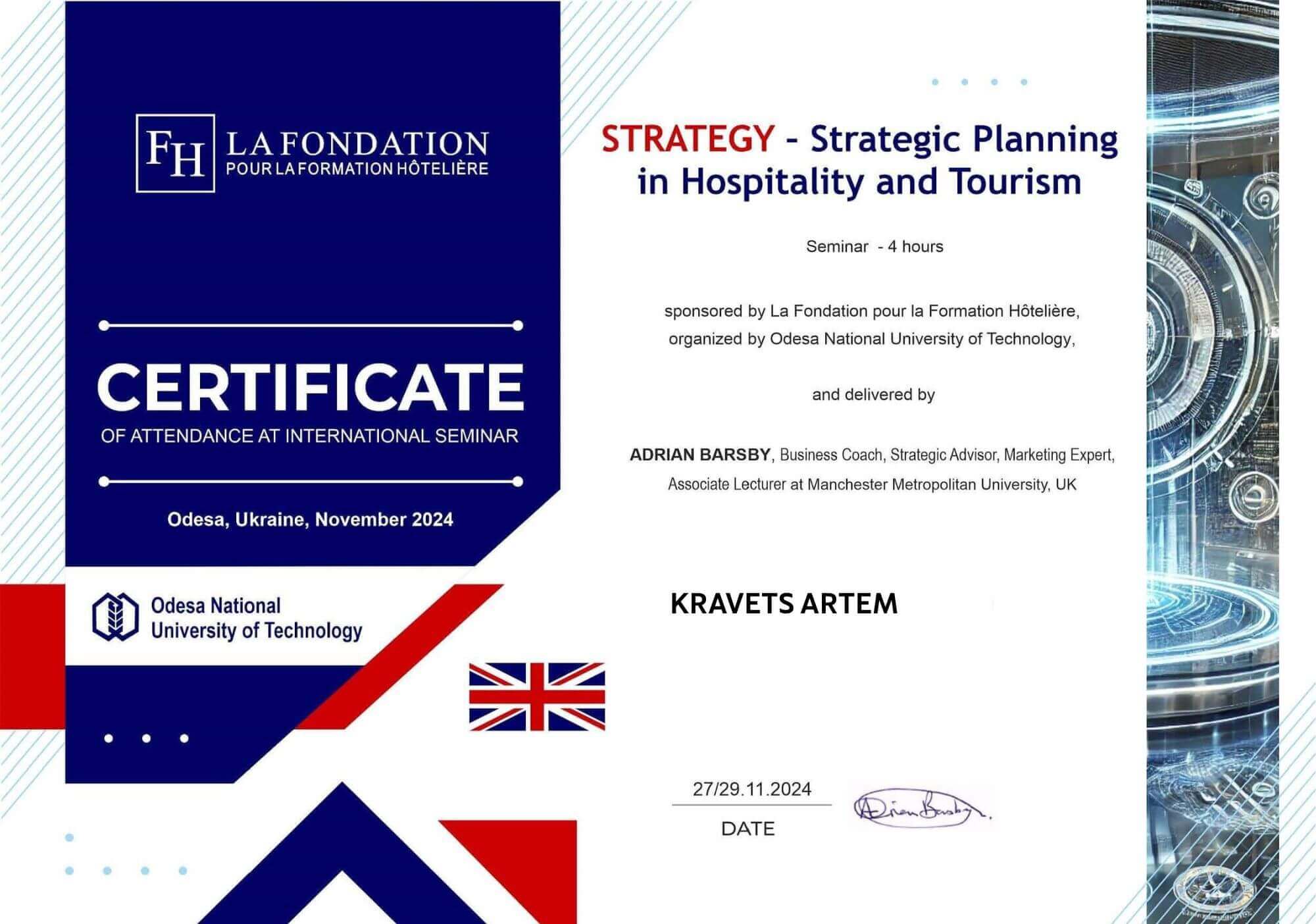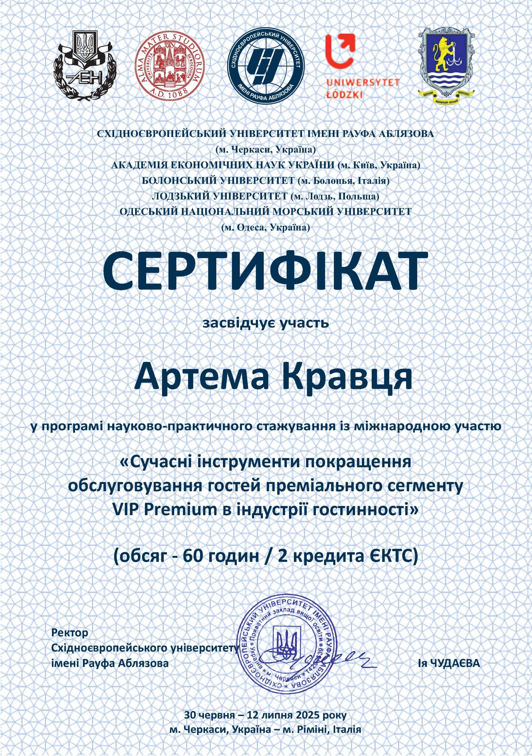 • Центральний національний технічний університет (спеціальність «Готельно-ресторанний бізнес та кейтеринг», кваліфікація – ступінь вищої освіти магістр, 2025)