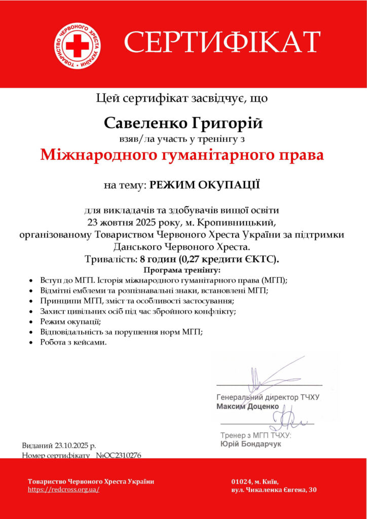 - Кіровоградський національний технічний університет (диплом спеціаліста, спеціальність «Економіка підприємства», кваліфікація – економіст, 2011 р.)
