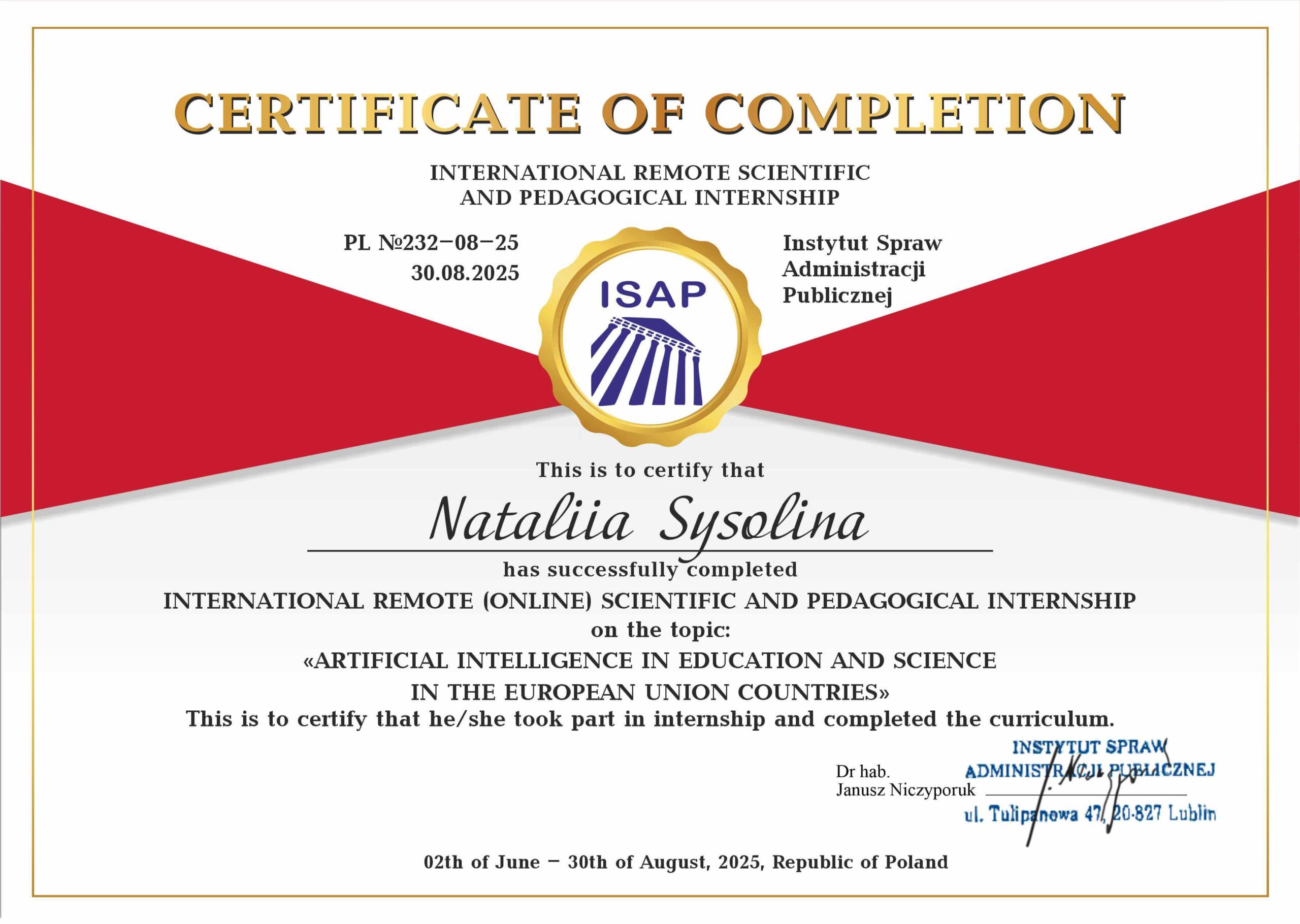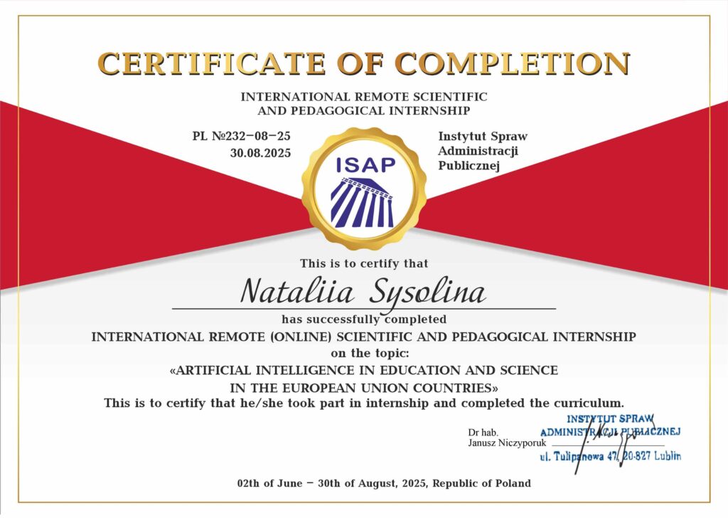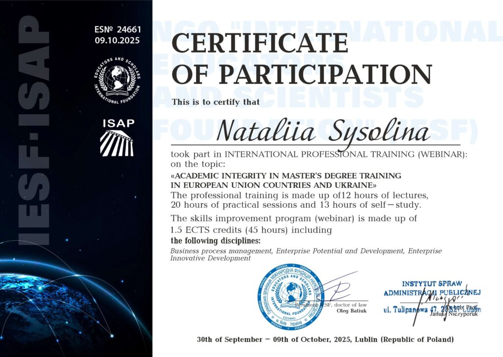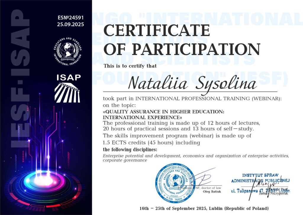 - Кіровоградський державний технічний університет (диплом спеціаліста, спеціальність «Облік і аудит», кваліфікація економіст, 1996 р.)