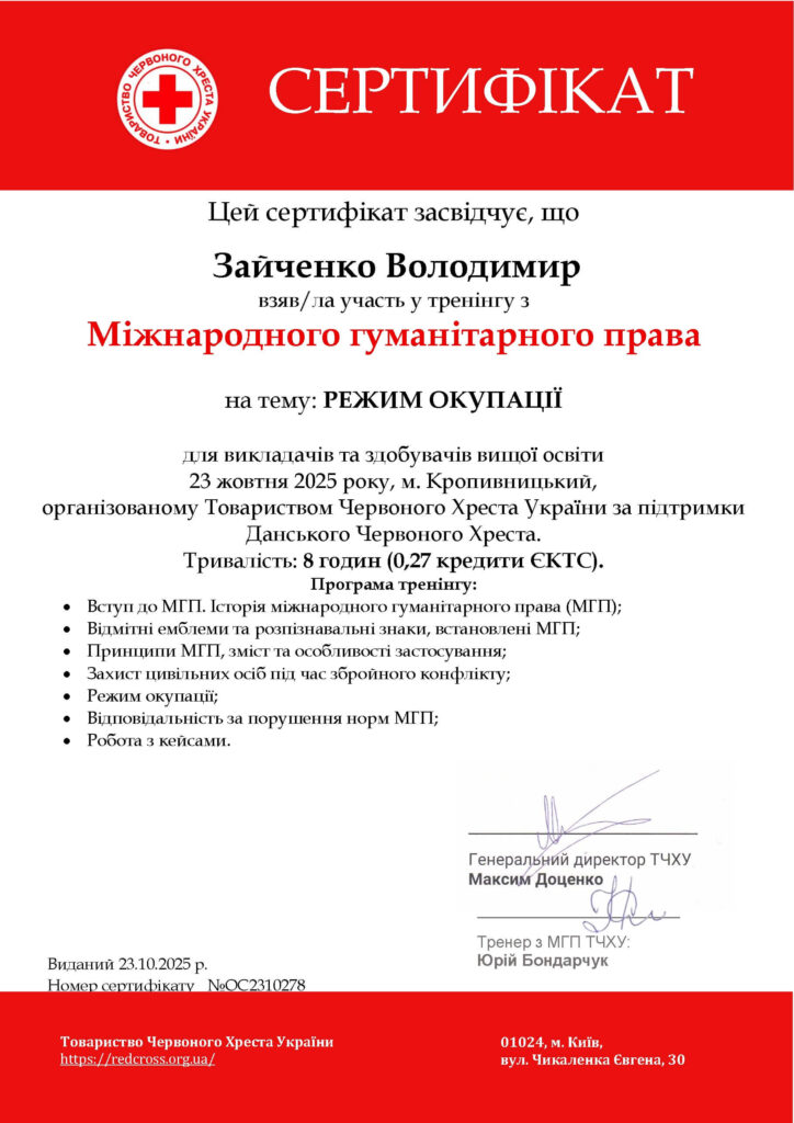 - Центральноукраїнський національний технічний університет (спеціальність «Агрономія», кваліфікація – магістр, 2021р.)
