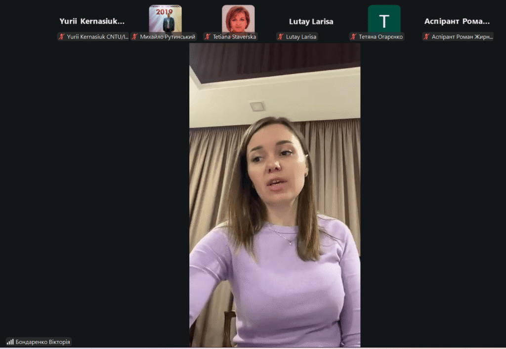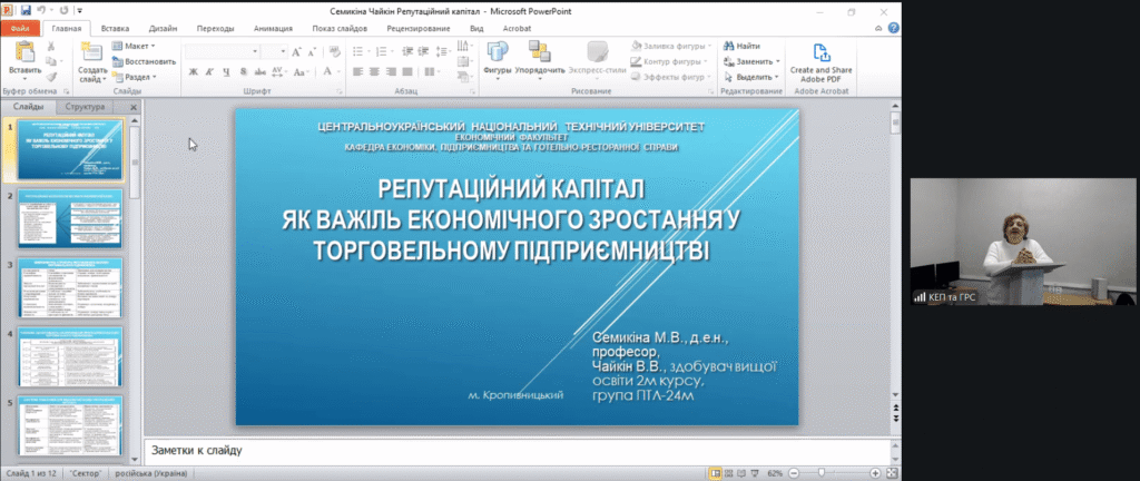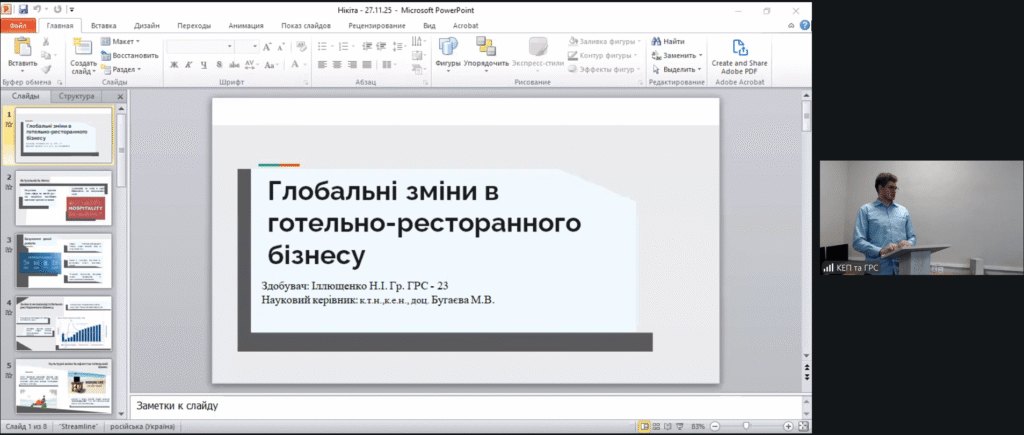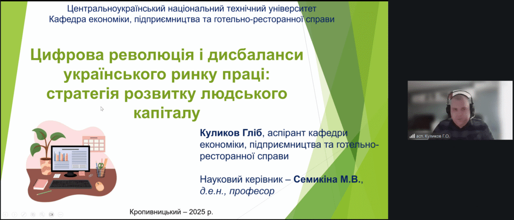 У роботі секцій прийняли участь і виступили з доповідями здобувачі третього рівня вищої освіти кафедри економіки, підприємництва та готельно-ресторанної справи ЦНТУ Гліб КУЛИКОВ, Сергій ГОЛБАНОС, здобувач третього рівня вищої освіти кафедри підприємництва, обліку та фінансів Херсонського державного аграрно-економічного університету Ігор ПОГОРІЛИЙ, лаборант кафедри економіки, підприємництва та готельно-ресторанної справи ЦНТУ Нікіта ІЛЛЮЩЕНКО, здобувачі другого (магістерського) рівня вищої освіти нашої кафедри Вікторія БОНДАРЕНКО та Владислав ЗАЇКА, здобувачі першого (бакалаврського) рівня вищої освіти першого та другого курсу кафедри економіки, підприємництва та готельно-ресторанної справи ЦНТУ Дар’я КУРТОВА, Анна БІЛОУС, Ірина ДОНЦОВА, Софія ЄФІМОВА, Олександра ГОРДІЄНКО.