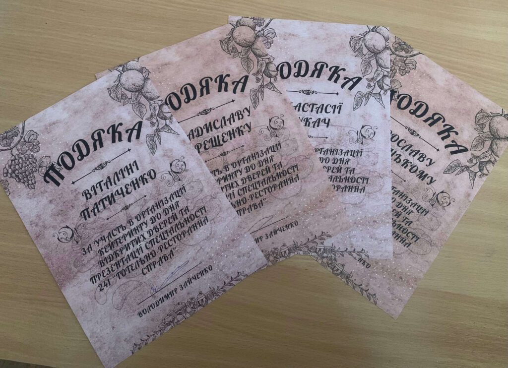 Сьогодні кафедра урочисто відзначила здобувачів вищої освіти подяками за їхню важливу участь в організації заходів, допомогу в кейтерингу, активну присутність на днях відкритих дверей та професійне представлення навчальних дисциплін. Особливу увагу було приділено презентації нової спеціальності 241 «Готельно-ресторанна справа», яка вже привертає увагу абітурієнтів.