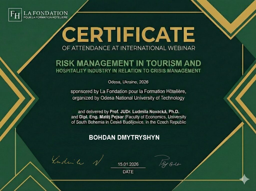 Викладачі кафедри економіки, підприємництва та готельно-ресторанної справи Михайло РУТИНСЬКИЙ, Володимир ДУБ, Сергій НІСФОЯН, Людмила ЗАПІРЧЕНКО, Богдан ДМИТРИШИН, Григорій САВЕЛЕНКО, Ольга ЧУМАЧЕНКО, Ірина ЖУРИЛО, Тетяна ОГАРЄНКО, Лариса ЗАДОРОЖНЯ, Наталія КОВАЛЬЧУК мали можливість 15 січня 2026 року долучитися до міжнародного вебінару «Risk Management in Tourism and Hospitality Industry in Relation to Crisis Management», присвяченого актуальним питанням управління ризиками та кризами у сфері туризму й гостинності. Особливу увагу було приділено практичним кейсам для туристичних дестинацій, готелів та івентів, що дозволяє інтегрувати міжнародний досвід в освітній процес та професійну діяльність.