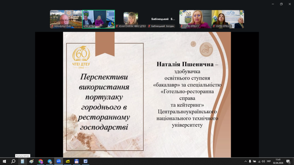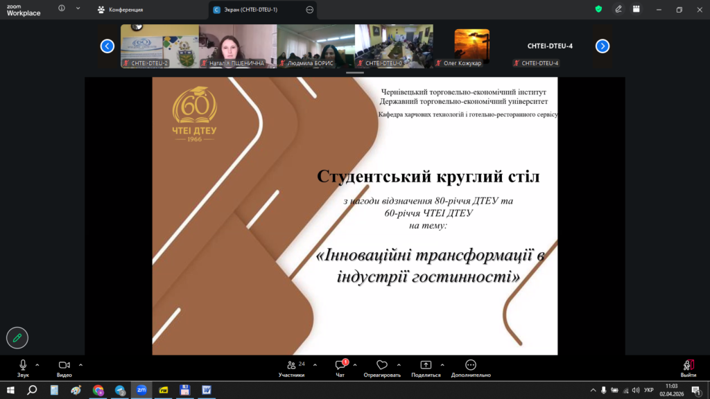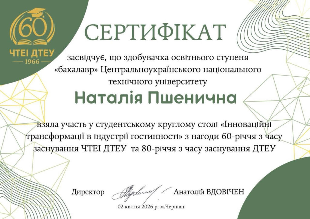 Згідно договору про співробітництво №16 від 17.09.2025 року між Чернівецьким торговельно-економічним інститутом Державного торговельно-економічного університету та Центральноукраїнським національним технічним університетом 2-го квітня 2026 року здобувачка першого освітнього рівня (бакалаврського) ГРС-25мбз Наталія ПШЕНИЧНА прийняла участь в роботі студентського круглого столу «Інноваційні трансформації в індустрії гостинності», який присвячений відзначенню 80-річчя ДТЕУ та 60-річчя ЧТЕІ ДТЕУ.