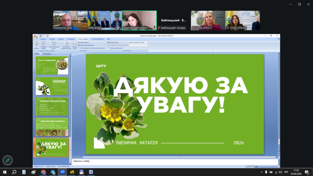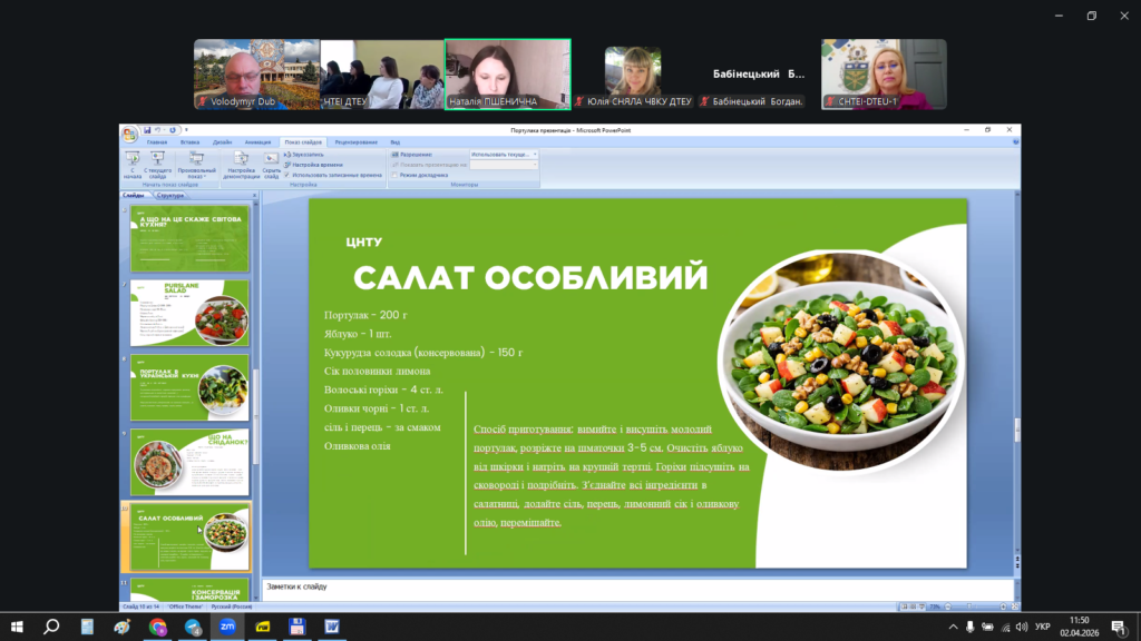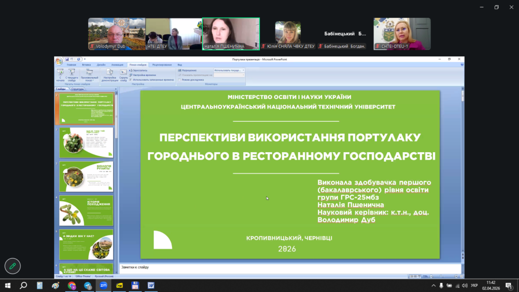 В межах діяльності наукового гуртка «Індустрія гостинності» під керівництвом доцента Володимира ДУБА здобувачкою Наталією ПШЕНИЧНОЮ було проведено аналітичне дослідження доцільності використання портулаку городнього в технологіях ресторанного господарства. Саме результатами даних досліджень і було представлено в доповіді на пленарному засідання студентського круглого столу «Інноваційні трансформації в індустрії гостинності» ЧТЕІ ДТЕУ згідно пункту 3.3 Положення про науковий гурток «Індустрія гостинності» здобувачів вищої освіти кафедри економіки, підприємництва та готельно-ресторанної справи ЦНТУ.